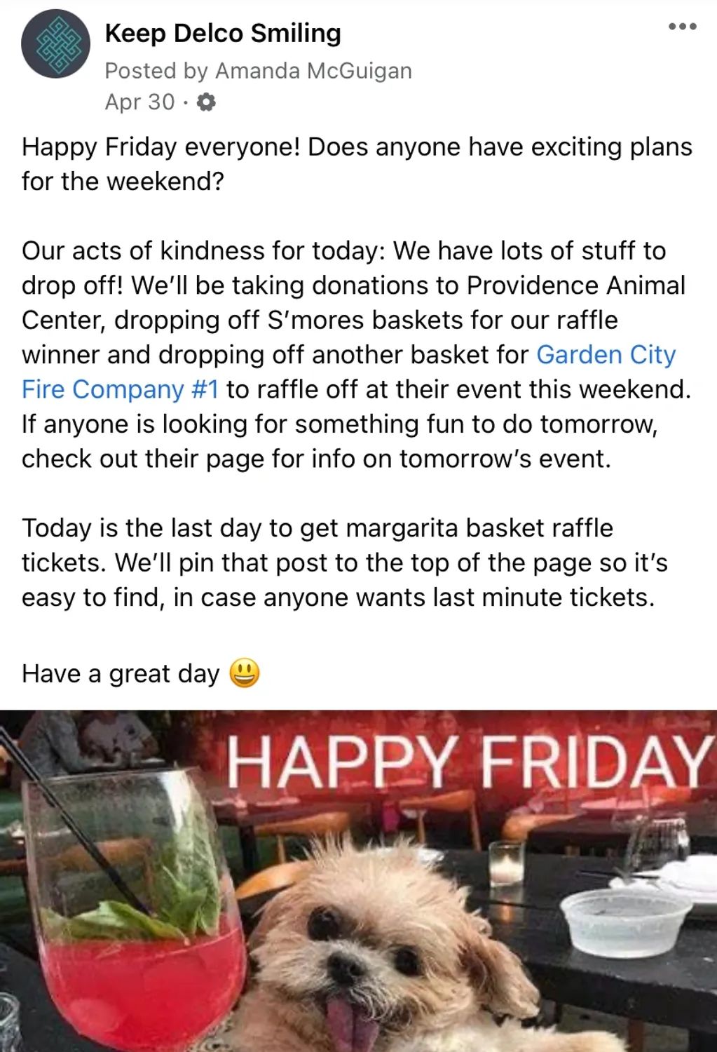 Happy Friday everyone! Does anyone have exciting plans for the weekend? Our acts of kindness for today: We have lots of stuff to drop off! We'll be taking donations to Providence Animal Center, dropping off S'mores baskets for our raffle winner and dropping off another basket for Garden City Fire Company #1 to raffle off at their event this weekend. If anyone is looking for something fun to do tomorrow, check out their page for info on tomorrow's event. Today is the last day to get margarita basket raffle tickets. We'll pin that post to the top of the page so it's easy to find, in case anyone wants last minute tickets. Have a great day 😄
