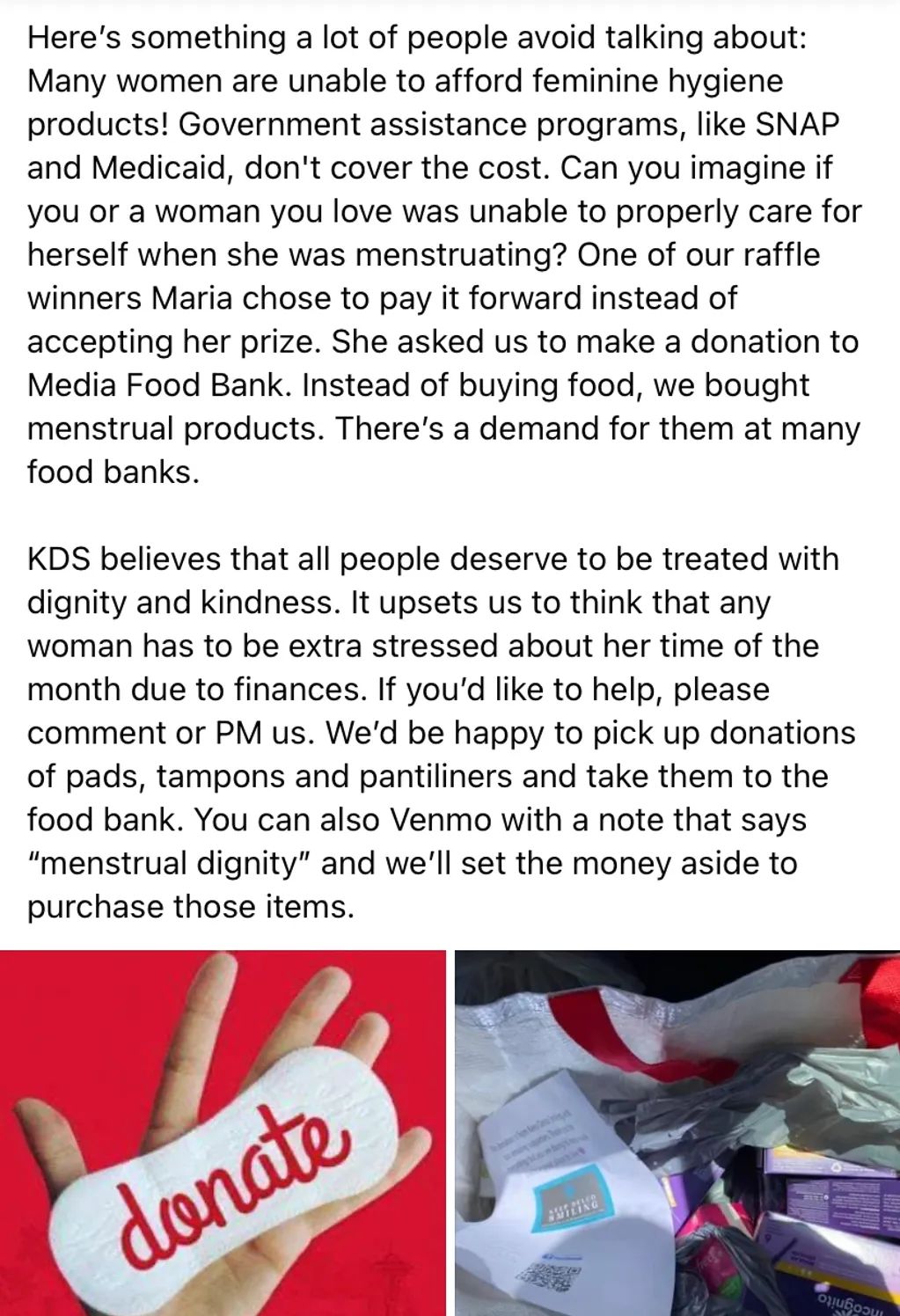 Here's something a lot of people avoid talking about: Many women are unable to afford feminine hygiene products! Government assistance programs, like SNAP and Medicaid, don't cover the cost. Can you imagine if you or a woman you love was unable to properly care for herself when she was menstruating? One of our raffle winners Maria chose to pay it forward instead of accepting her prize. She asked us to make a donation to Media Food Bank. Instead of buying food, we bought menstrual products. There's a demand for them at many food banks.